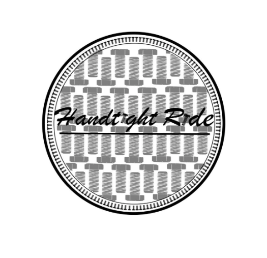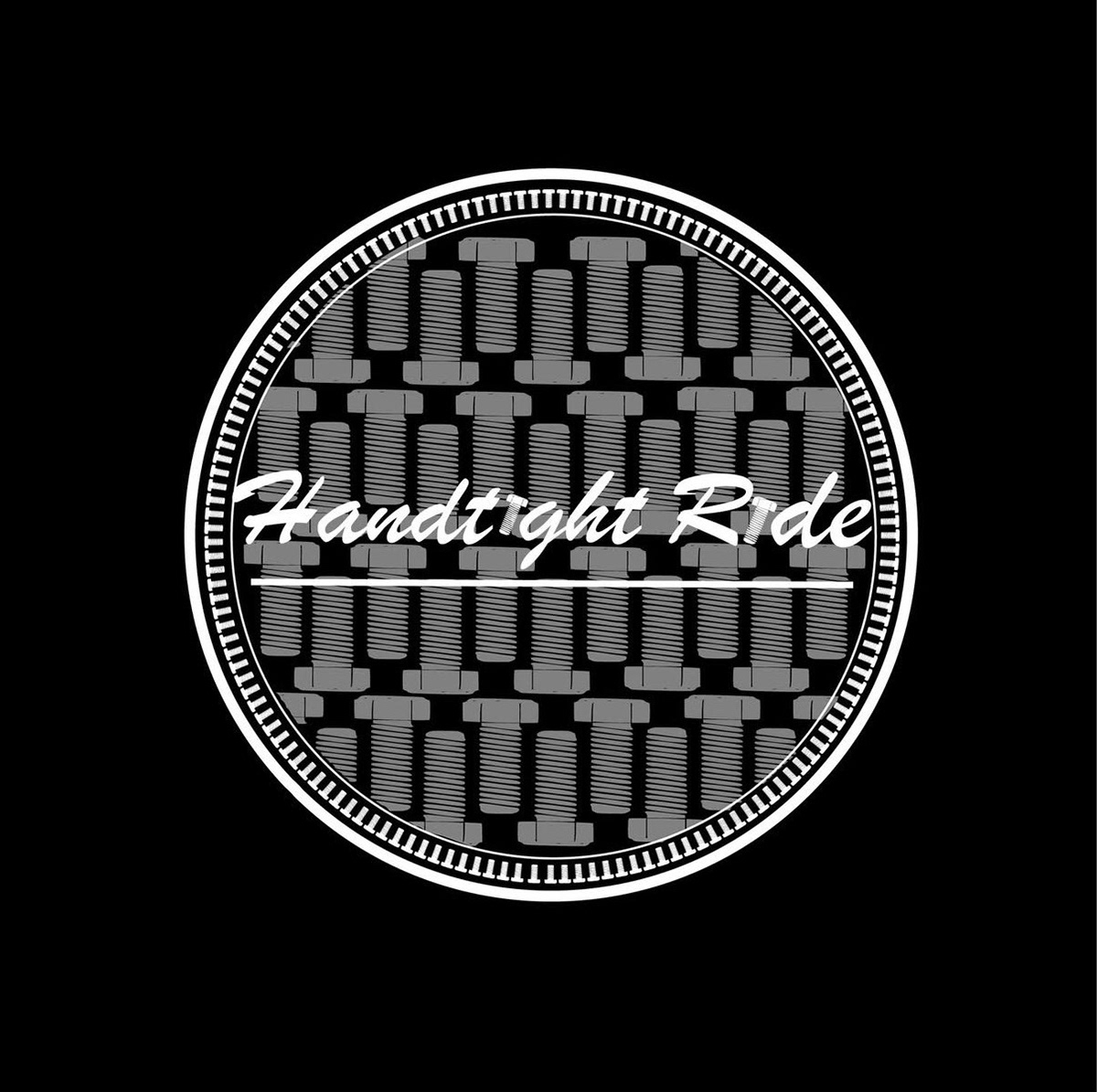 This version features a bold circular design packed with repeating bolt icons — a symbol of strength, craftsmanship, and attention to detail. The script “Handtight Ride” across the center adds a personal, custom-built touch, giving it a balanced mix of industrial grit and refined style. Perfect for print materials or merchandise.